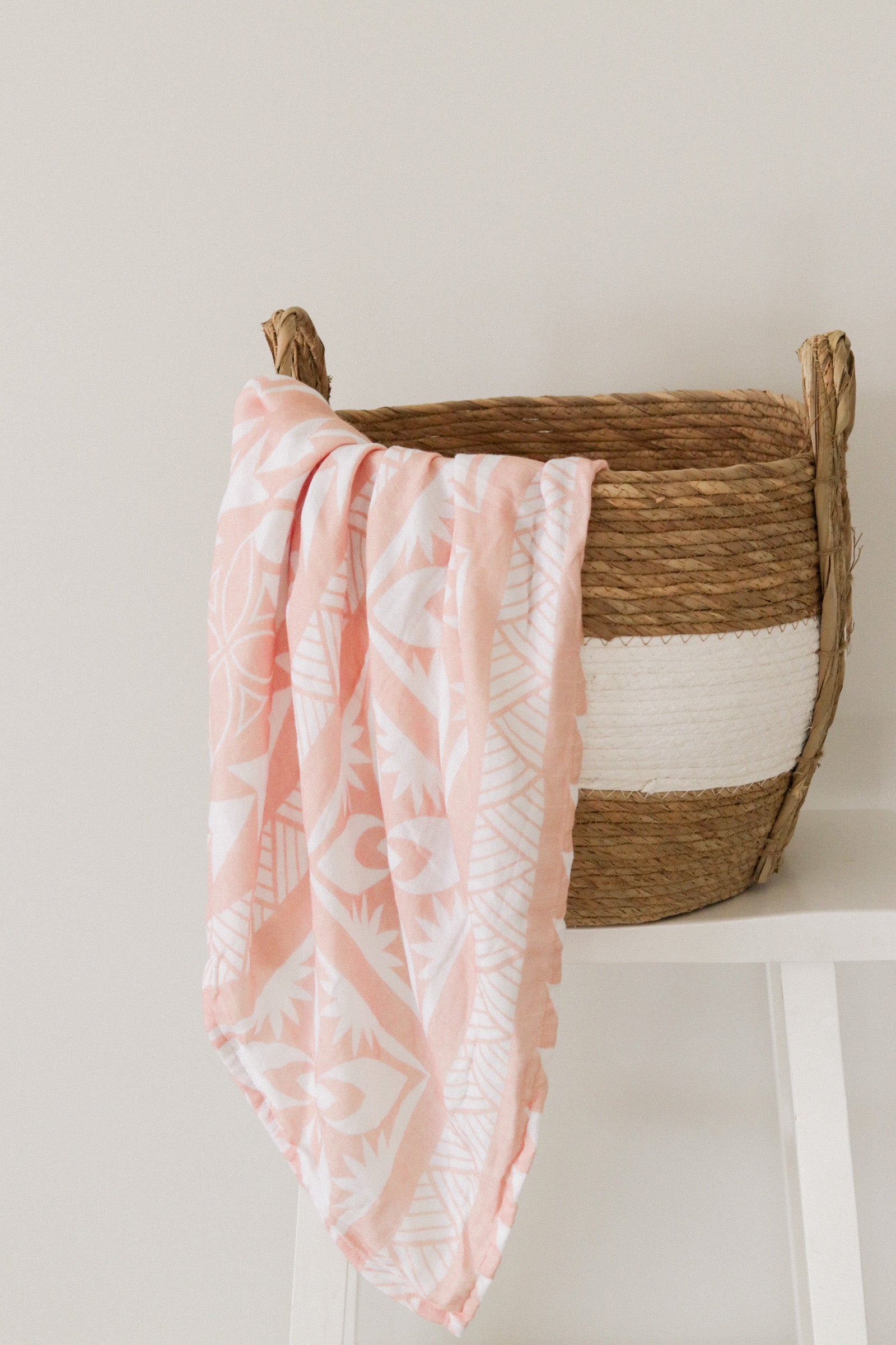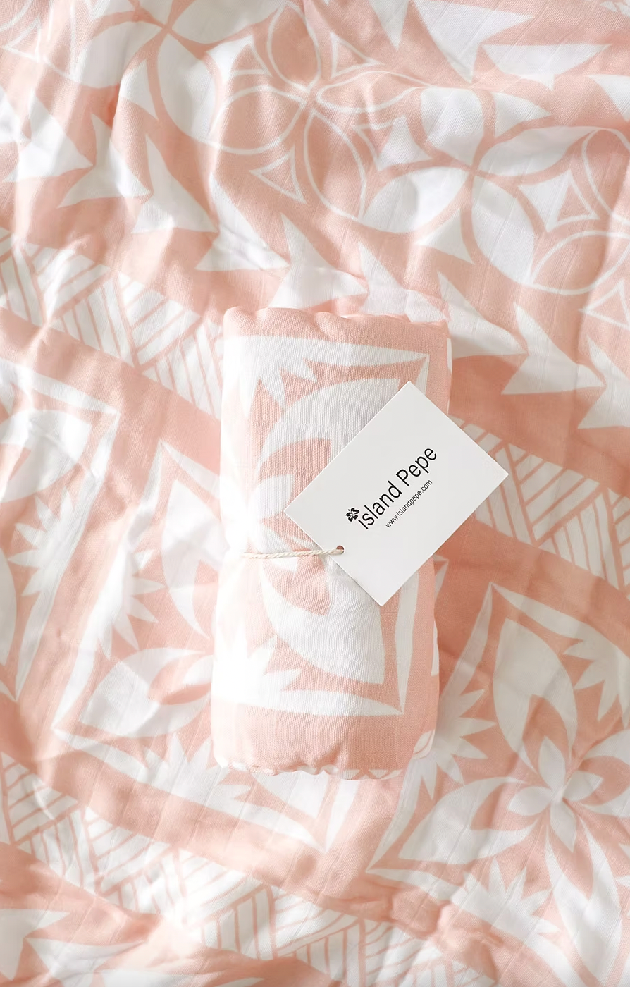 Lange en mousseline pêche ornée de motifs polynésiens blancs. Mālū signifie Brise en samoan, inspirée par l'essence des îles du Pacifique.
