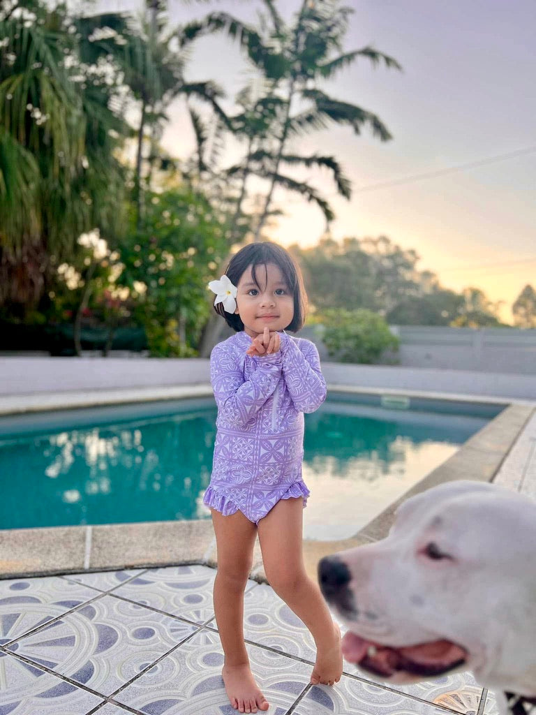 Inspiré des motifs de l'océan Pacifique, ce modèle offre une protection solaire UPF 50 et des manches longues pour jouer au soleil en sécurité.